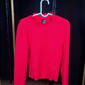 This vibrant red knit top features a stylish ruffled neckline, perfect for adding a pop of color to your wardrobe. Ideal for both casual and dressy occasions.
