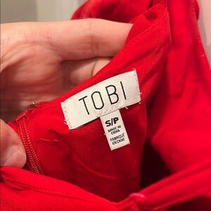 Elegant red ruffled dress with lace detailing. Perfect for special occasions.