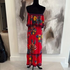 This vibrant red sundress is perfect for resort wear, featuring a ruffled, off-the-shoulder neckline and a tiered, high-low skirt. The sleeveless design and strapless fit make it ideal for warm, sunny days, while the playful ruffles add a touch of elegance and flair.