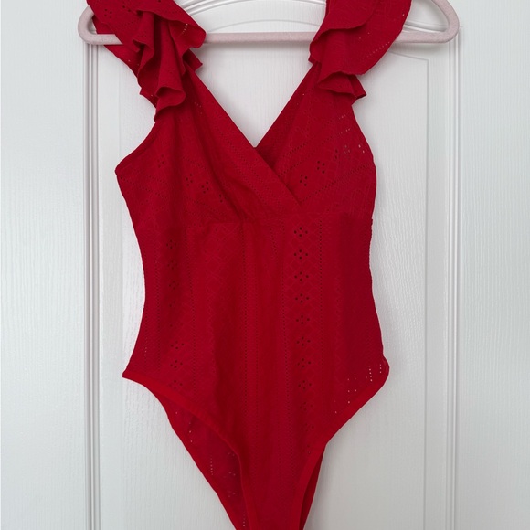 Stylish red one-piece swimsuit with ruffled straps. Perfect for a chic beach look.