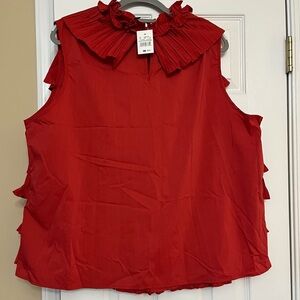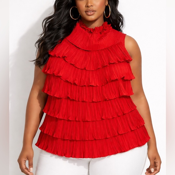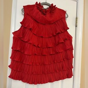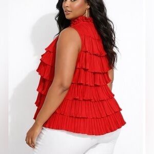Vibrant red sleeveless top with layered ruffles. Perfect for a bold statement look.