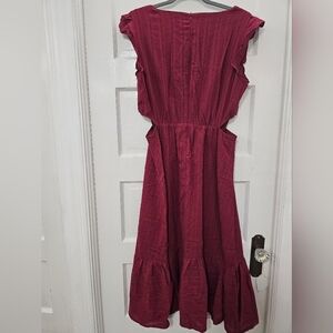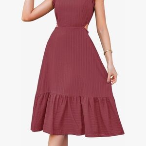 This red sundress features a charming ruffled design, cutout sides, and a smocked detail, perfect for a wedding guest or cocktail occasion. The sleeveless style with flutter sleeves and a crew neck adds a touch of elegance, while the midi length offers a classic silhouette.