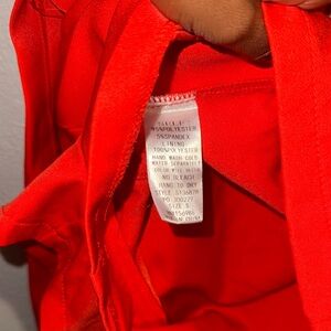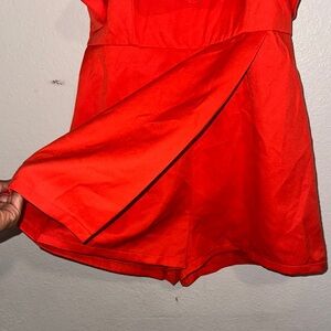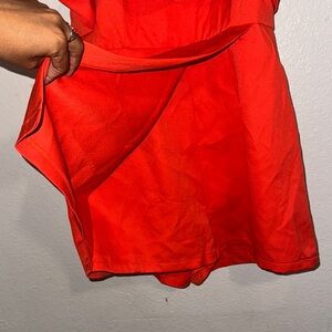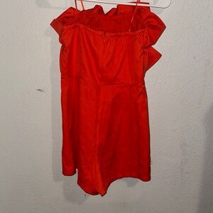 Vibrant red strapless romper with ruffle details. Perfect for a bold look.