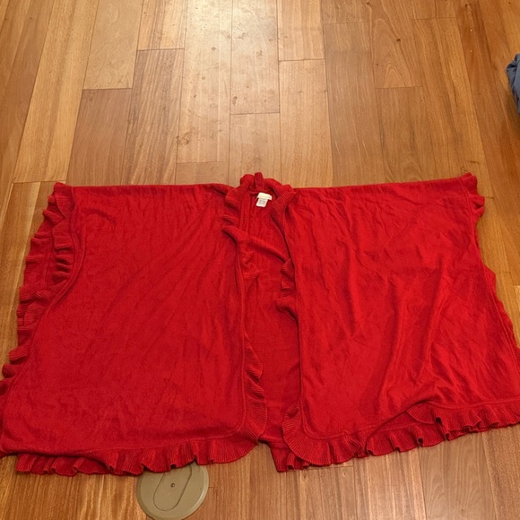 Cozy red acrylic shawl with ruffled edge. Bright red/orange color.