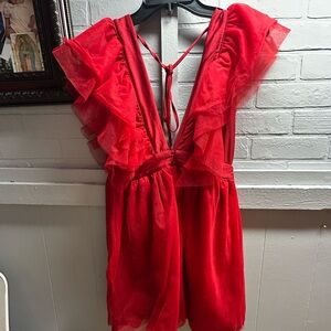 Elegant red dress with ruffled sleeves and deep V-neck. Perfect for special occasions.