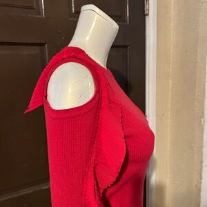 Elegant red blouse with stylish ruffled sleeves. Perfect for any occasion.