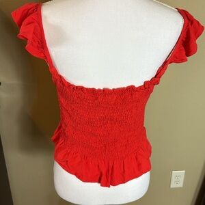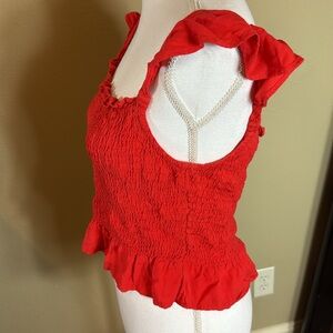 Chic and stylish red ruffled top for women. Perfect for any occasion. Size medium Sim and Sam — smocked with ruffled cap sleeves and hem 16 inches pit to pit — 11 inches length 100% rayon cropped summer top