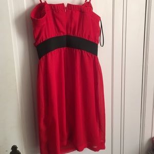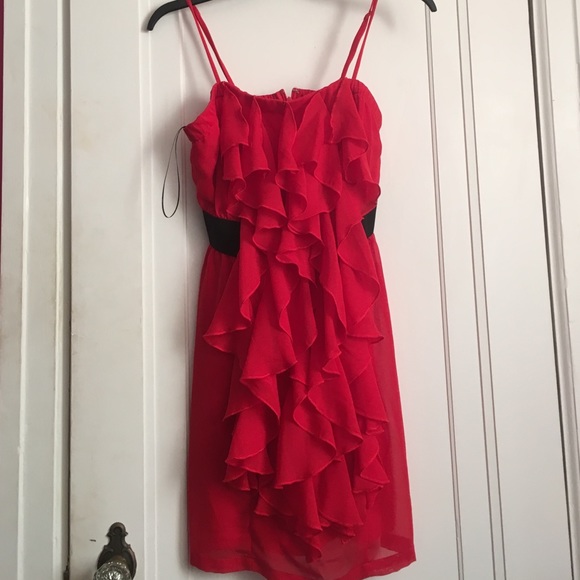 Bright red w/ Ruffles down the front & a black waistband! Worn once!