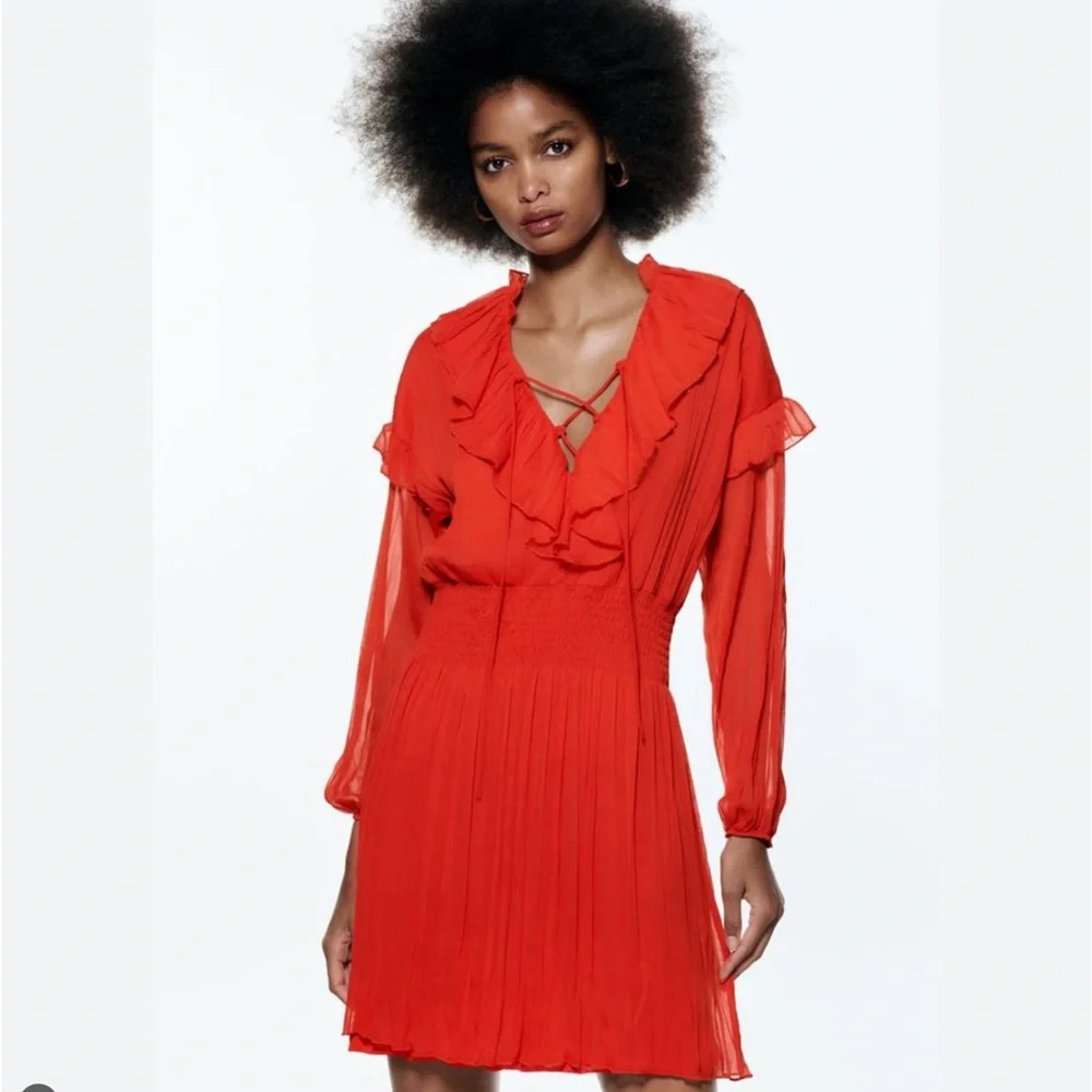 Red mini ruffled dress with long sleeves. New without tags never worn.