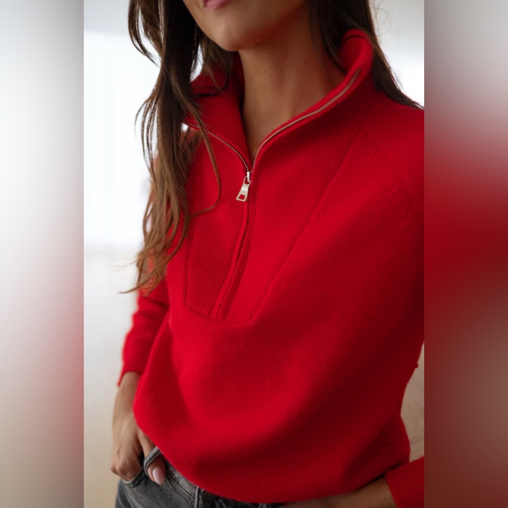 Stay cozy and stylish with this vibrant red half-zip sweater. Perfect for layering and adding a pop of color to your wardrobe.