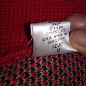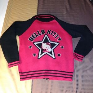 Sorry if it looks pink in the picture, it’s red! It’s a sort of woven material. The hello kitty on the back has a pom pom attached. Zips up all the way to the collar.