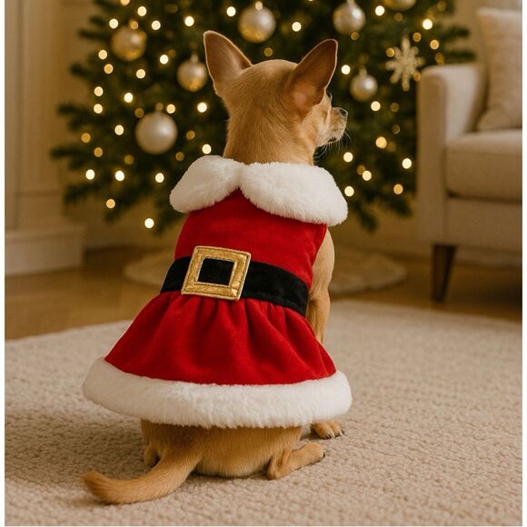 Adorable holiday pet dress in a classic Santa style soft, plush, and perfect for cozy Christmas photos, festive parties, or gift-ready holiday moments. The faux-fur trim and gold belt detail give it an irresistibly cute, high-quality look.