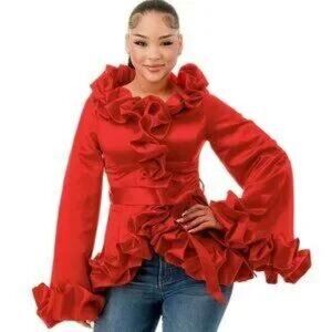 Make a bold entrance with this red satin ruffle wrap blouse, featuring oversized bell sleeves, tiered ruffle trim, and a cinched waist tie for a flattering silhouette. This dramatic top is perfect for birthdays, date nights, or fashion-forward events.