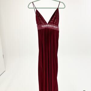 Red Y2K maxi dress with triangle bust, lace/eyelet detail at bust and pleated accents throughout.