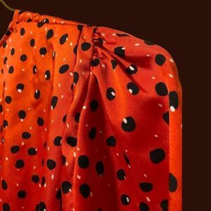 There’s something very sassy about this fabulous red polka dotted blouse. Folks will be fascinated with the unique polka dot pattern. The material is so soft and it has a vivacious v-neckline, demure domed sleeve, with classic cuff detail. The peplum waist both beautiful and strategic to conceal and/or accentuate the waistline. This blouse is perfect for the busy woman because it can be worn with a ton of options.