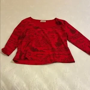 Stylish red top with script print. Features long sleeves and a scoop neck 3/4 sleeve