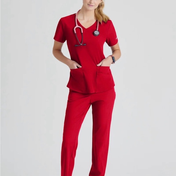 Stylish red scrub set with short sleeves and pockets. Perfect for healthcare professionals.