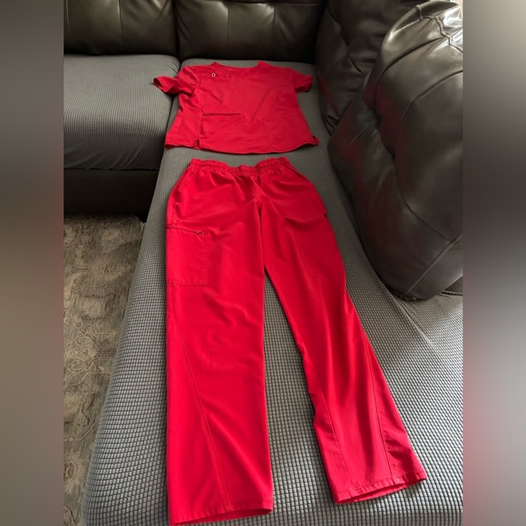 Bright red scrub top and pants . Good condition. No stains or tears. Tags removed. Elasticized waist. Bottoms fits like xtra small/small. Top fits like small/ medium. 30 for set