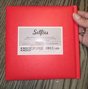 Knock Knock Selfies Photo Album," designed for storing and displaying printed selfies. It features a padded hardcover with a mirrored embellishment and foil stamping. The album contains 16 sheets with die-cut slots for 27 images in three different sizes: 2x2, 3x3, and 4x4 inches. It encourages users to get their selfies off their smartphones and into a physical album.