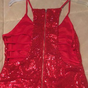 Gorgeous shiney red sequin evening dress. Cut out sides, zippered back, spaghetti straps, v-neckline, 18"p2p, 36"length. Has been pre-worn but is in good shape.