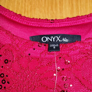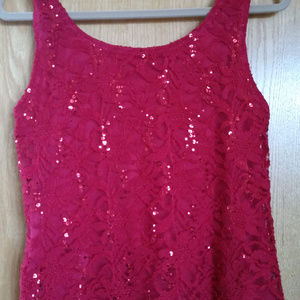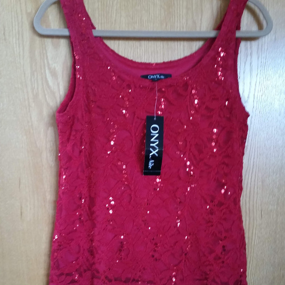 Onyx Nites Red Sequined Holiday Tank. Scoop- neck, stretchy pull on, lined top. Size small. 17" pit to pit laying flat-unstretched, 16" from mid neckline to hem.Never worn. This is a new top, unworn. When first posted, it had the tag, but I just found that the tag must have gotten pulled off and disappeared when I moved it into a different garment bag.