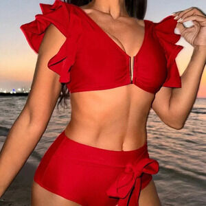 Red Sexy Women's V-Neck Bikini Set With Metallic Buckle & Ruffled Hem Design