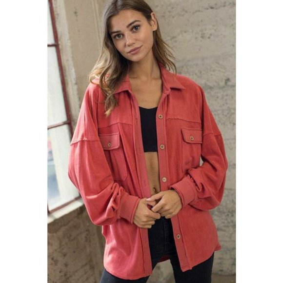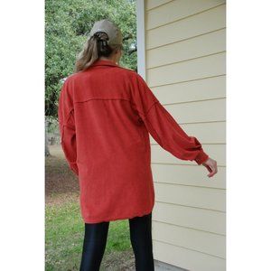 This oversized lipstick colored shacket is super velvety soft. It features details to give it a casual feel. Beautiful addition to a jeans and t-shirt day.