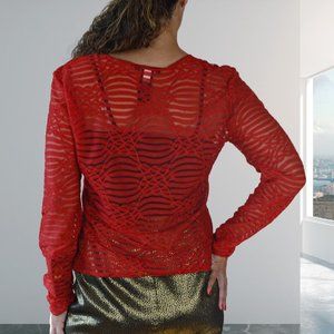 This red sheer 90s blouse is sexy and covering. The long sleeves and higher scoop next still gives coverage. Have fun playing with different colored tops beneath and maximize the bottoms you have in your closet from jeans to skirts. The model wears a size 4 this top is a size large.