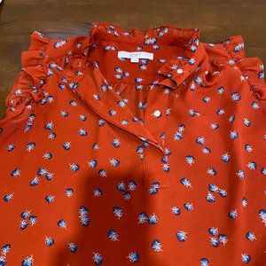 Loft shell top, red with cute blue and white flower print. 4 buttons, can be worn fully buttoned or open. Ruffle sleeve and collar. Great for summer work top. Size small.