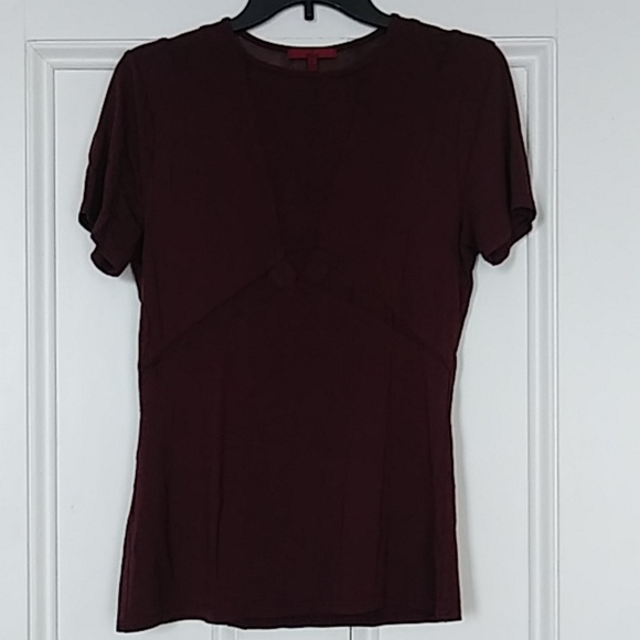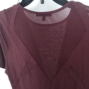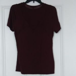 Maroon short sleeve top. Self 97% Viscose 3% spandex Contrast 90% nylon 10% spandex
