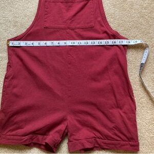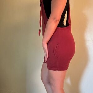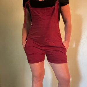 Stylish red short overalls with adjustable straps. Perfect for casual outings.