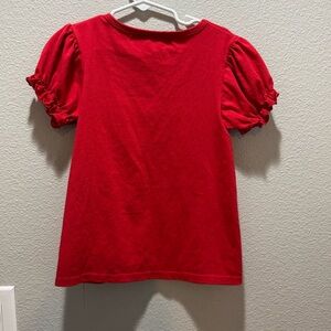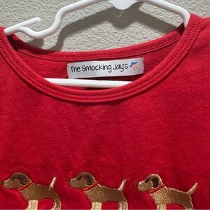 This vibrant red short sleeve tee features a charming design of three embroidered dog across the chest in light brown tones. The soft fabric and rounded collar style provide comfort, making it perfect for festive or everyday occasions.