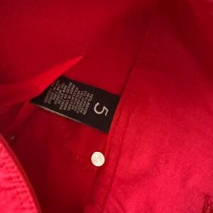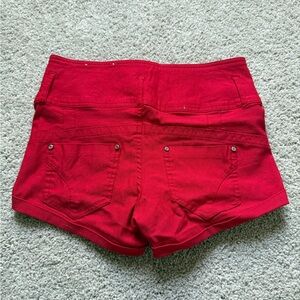 Super stretchy high rise red shorts! These hug your body in a way that is super flattering. They are decently short. Size 5, would best fit a women’s 6.