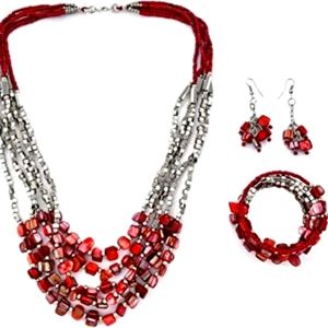 Red Silver Beaded Shell Multi Strand Necklace 3 PC Set