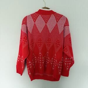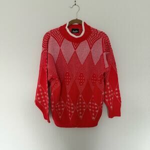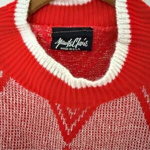 Vintage Red & Silver Mock Neck Sweater Metallic Threading in good vintage condition. Size tag is missing. Feels like a synthetic fabric. Would work well as a M/L. Get the best deals when you bundle items together. I’ll respond to any offer you send me. 0255-2501