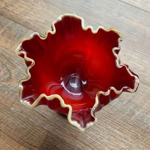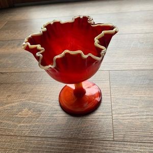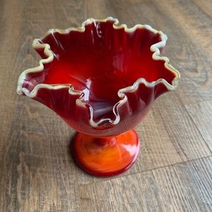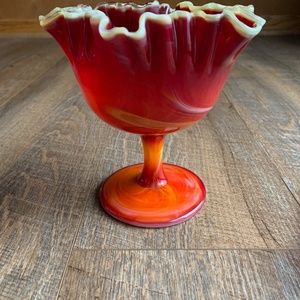 Beautiful red swirl slag glass pedestal compote bowl with ruffled rim.