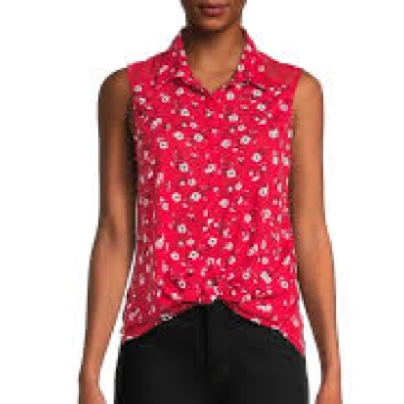 Red sleeveless button-down shirt with a pattern of white daisies. Great feature is the criss-cross strap design at the upper back. The shirt has a collared neckline and button-down front, and is made from a lightweight fabric.