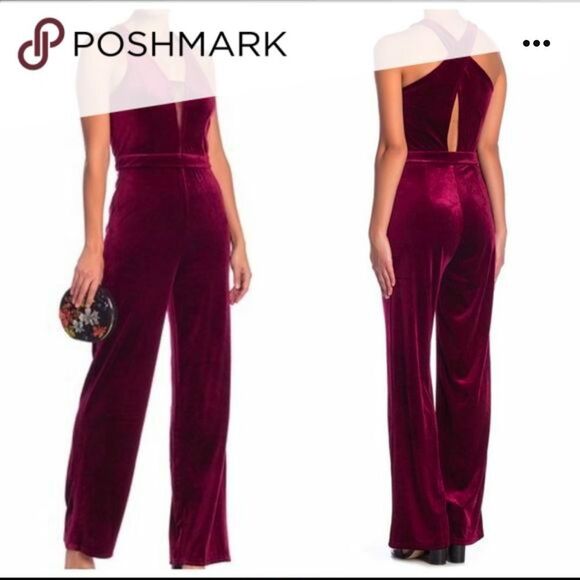 This sleeveless jumpsuit in a rich burgundy color features a plunging V-neckline and a fitted waist for a sleek and form-fitting silhouette.