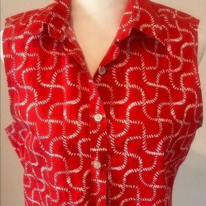 Stylish red sleeveless blouse. Features a unique white pattern. Perfect for casual or formal wear.