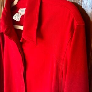 Minimalist red button down by Sag Harbor. Buttons are concealed for a sleek slimline look. The stretch polyester/spandex blend fabric gives a microfiber touch and feel. Very classy and demure for its statement siren red color.