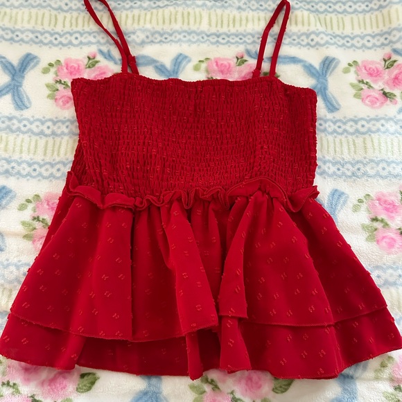 Chic red smocked top with ruffle details. Perfect for casual outings.