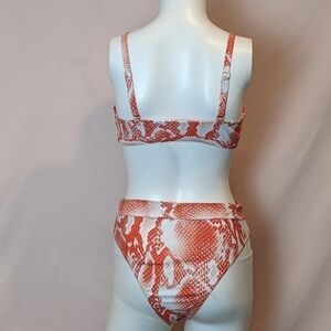White and red orange snakeskin Print Bikini with rose gold ring neckline. New without tags