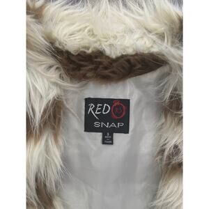 This is a stylish faux fur vest by Red Snap, featuring a striking striped pattern in brown and cream. The vest is designed for a bold, fashionable look, perfect for adding a touch of flair to any outfit. It is a size small.