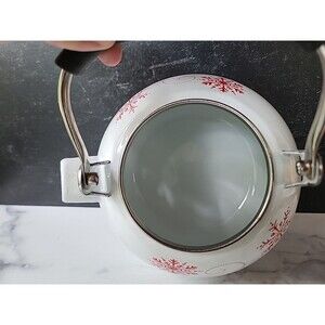 This is a winter themed white tea kettle with red snowflakes.