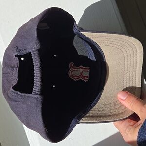 Hat has that awesome soft blue/vintage-y look. Elastic back, size marked Infant, but ours wore it through toddler age.
