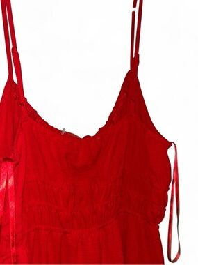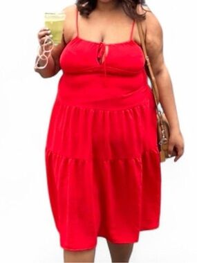 Flattering red sundress with adjustable spaghetti straps. Lightweight and comfortable movement. Keyhole tie at the neckline for a feminine touch. Easy, breezy style perfect for warm-weather outings.