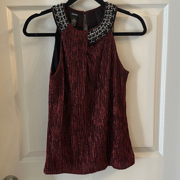 Red Sparkly Top. Sleeveless. Buttons at neck in back. Bling detail around neck.