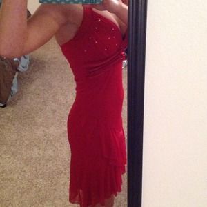 Will fit small too! Pretty halter dress with rhinestones on the top, satin straps, a gathered middle and flowing skirt. Slight hi-lo style. Great for a holiday party, wedding, salsa dancing or any special occasion. Worn once. Like new.