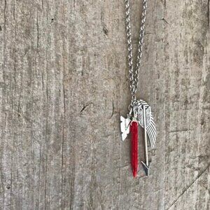 Symbolizing positivity, protection, courage, and strength this long layering necklace is a must-have for your bohemian jewelry collection. Featuring a striking red stone spike, arrowhead, angel wing, and arrow charms. You'll want to wear this alone or layered together with your other bohemian necklaces.
