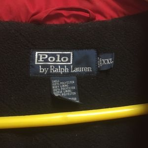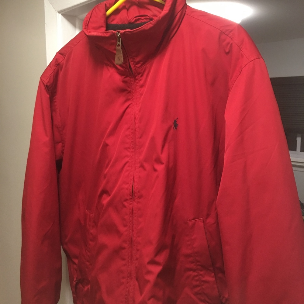 Red spring/fall Polo Ralph Lauren Jacket. Black lining. Polo horse insignia on jacket and zipper. A few years old but hardly worn - in good used condition. Size is XXL but fits more like a XL. It's not huge.
